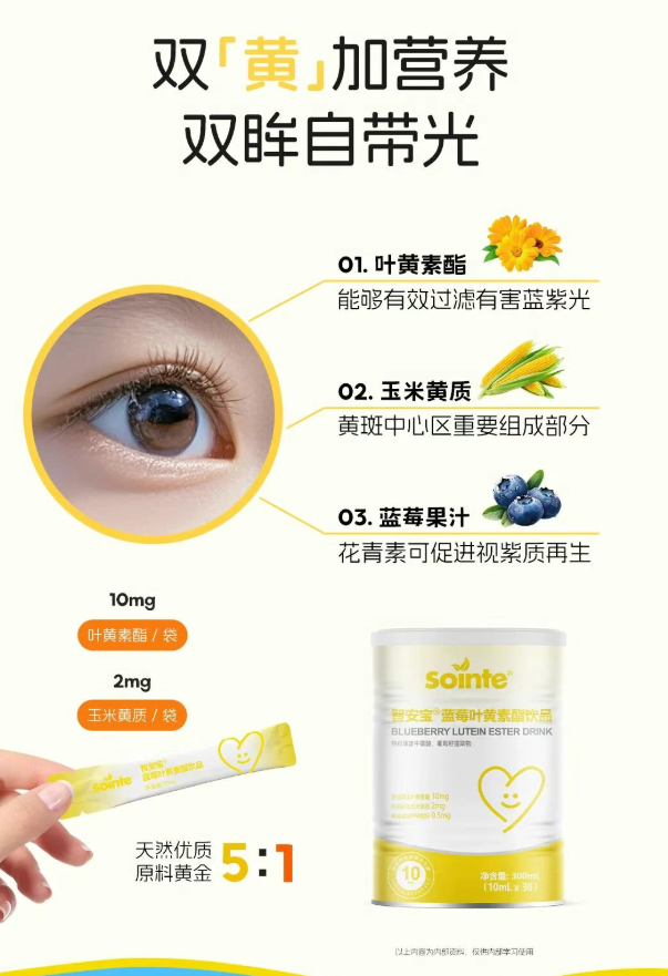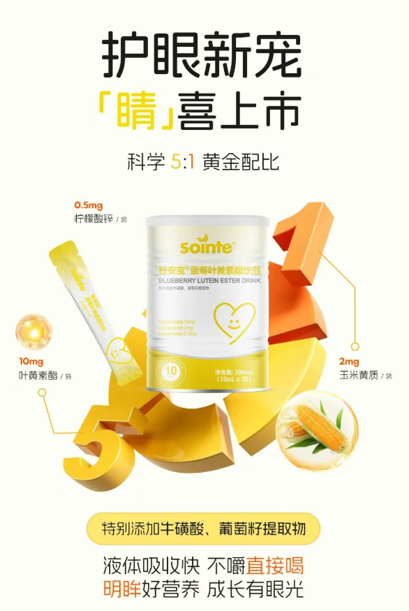 正是基于这一社会痛点,舒婴特婴童营养品针对儿童视力健康问题,研发推出了全新护眼产品——智安宝®蓝莓叶黄素酯饮品,采用先进的生产工艺和优质的原料,独立包装,一撕即饮。开始护眼新“食”代!